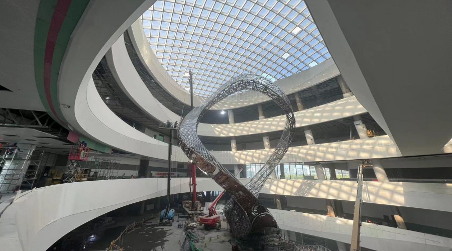 在當代大型公共建筑的設計中,中庭攔河不僅是空間分隔的功能載體,更是建筑美學與結構性能的集中表達。西安長安云項目作為“一帶一路”文化交流中心的核心地標,其GRG(玻璃纖維增強石膏)攔河造型以“云橫秦嶺”的流動美學,突破了傳統材料的性能邊界,重新定義了建筑裝飾構件的技術標準。本文將從材料特性、設計邏輯、施工工藝三個維度,解析長安云項目中GRG攔河造型的技術突破,并對比傳統材料的局限性。